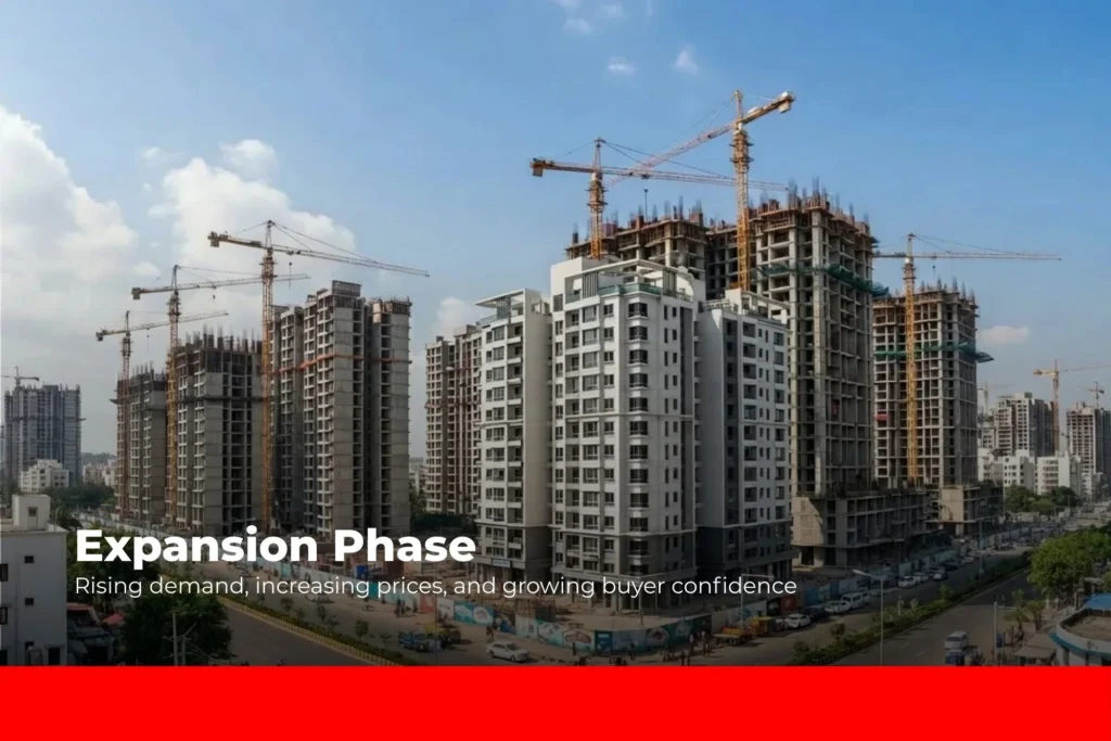 When demand starts rising, job conditions improve and lending becomes easier. Prices grow steadily, and new projects launch across the market. Most first-time buyers enter during this stage, while overall market confidence builds month by month.