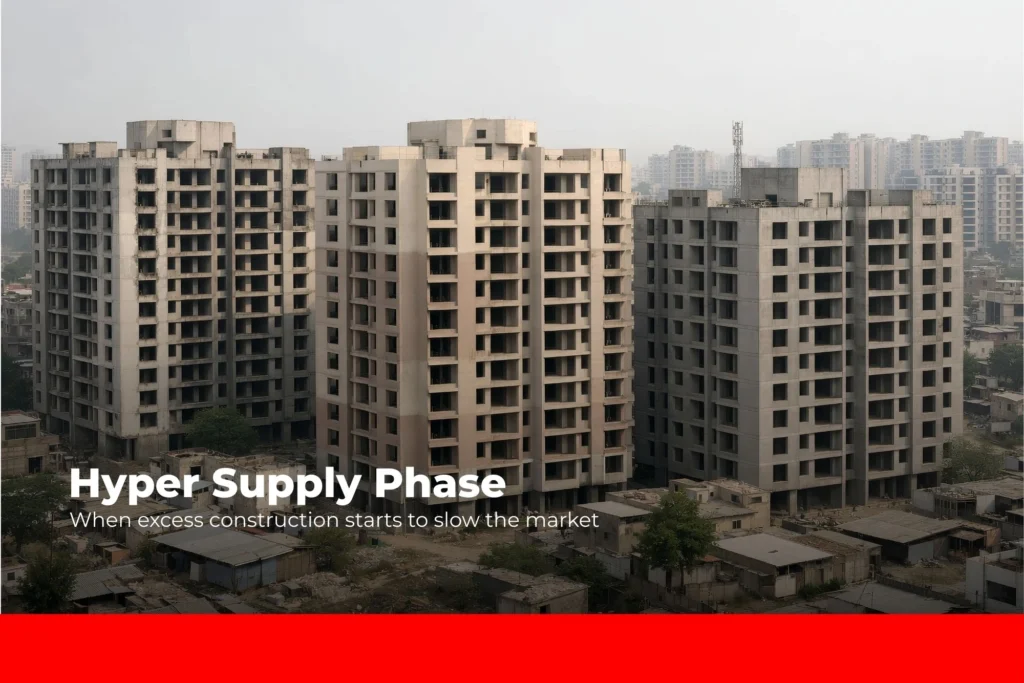 During this stage, developers overbuild due to strong demand. Inventory rises fast and price growth begins to slow. Discounts and offers appear, the buyers gain negotiation power, and sellers must compete harder.